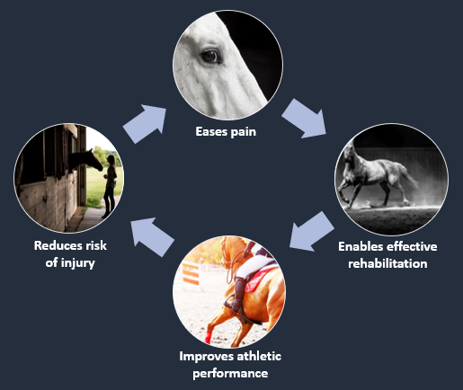 Each session varies depending on the assessment findings. Generally, dogs need 30-45 mins, while horses require a little longer at 90-120 mins for their initial consultation. The session starts with a complete assessment, followed by treatment, which may include using an electrotherapy device such as therapeutic ultrasound, laser, pulsed electromagnetic field or muscle stimulation. These devices complement the manual therapies used and help to prolong the treatment effects.